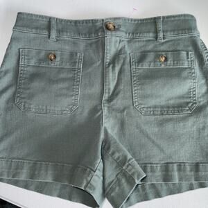 The Loft The Palmer Short 6 in green is a stylish pair of women's shorts from the brand LOFT. These regular fit shorts are made of cotton and feature a flat front design with pockets, making them perfect for casual occasions. With a machine washable garment care option, these shorts are both convenient and easy to maintain. The size 6 ensures a comfortable fit for everyday wear.