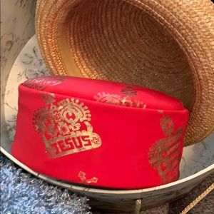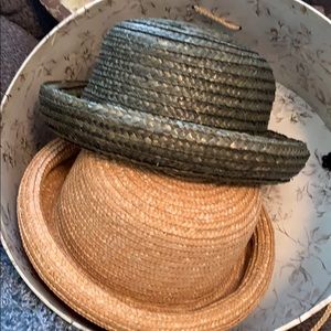 Two straw hats and a red fabric Jesus pill box hat. All for one low price.