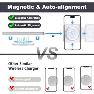 🧿3 in one Fold Up Charger Station: The wireless charging pad contains a magnetic suction, which can automatically and accurately charge the iPhone 12 and above series. The magnetic suction is suitable for iPhone 16/16 Plus/16Pro/16 Pro max15/15 Plus/15Pro/15 Pro max/14/14 Pro/14 Plus/14 Pro Max/13/13 Pro/13 Pro Max/12/12 Pro/12 Pro Max. It is also compatible with Apple Watch Ultra 10 9 8 7 6 5 4 3 2 & AirPods(Note: only support AirPods 2/3/4 with magnetic devices).