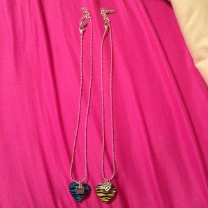 One is a pretty blue bead. The other is a pink cross that says love. And the last is a set; they are best friend forever necklaces!