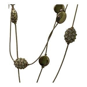 This gold-tone necklace features three delicate chains of varying lengths. The chains are adorned with smooth, oval-shaped beads and round clusters of sparkling clear rhinestones.