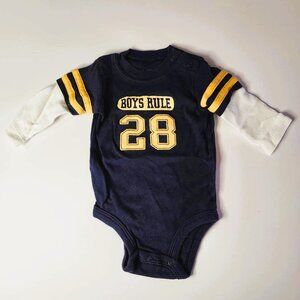 3 month football inspired baby boy clothes. One stain on arm of "boys rule" onesie (shown in photo). Clothing is from Carter's, Baby Gear and Gerber.