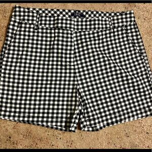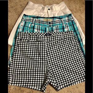 White shorts are by Liz Claiborne in size 12. 100% cotton. Has a small spot, see picture. The black and white one is by Izod in size 12 in 100% cotton and the blue striped one i am not sure what brand is 97% cotton and 3% spandex.