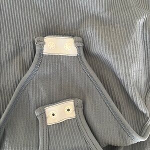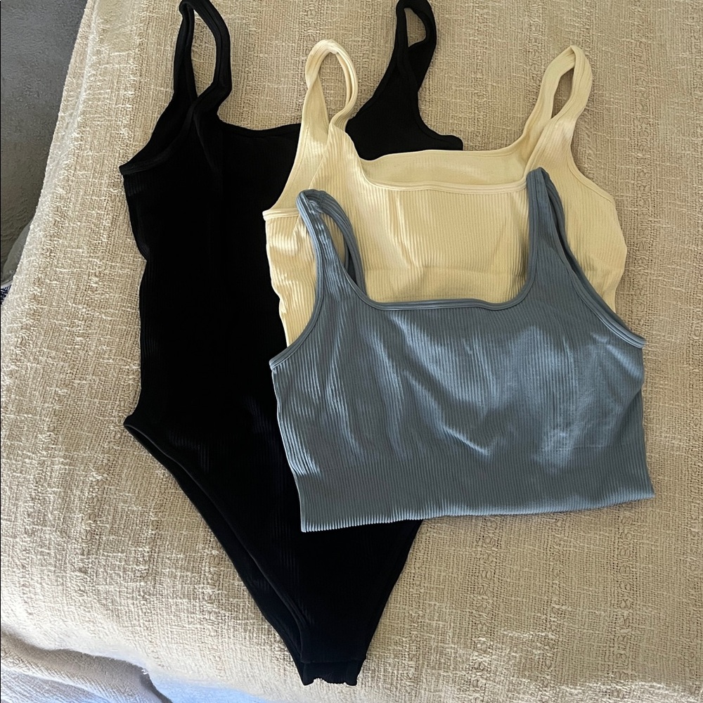 Set of ribbed tank tops in black, cream, and blue. Waist cinching and snap closure with cheeky cut bottom. Stretchy and elastic.