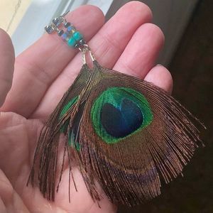 Feather starts with a blue faceted crystal stud then dangles “ to the end of the feather 3 1/4”. In between is 4 beads approximate 4 mm -two silver blue, one faced translucent clear dichroic, and a blue turquoise color.