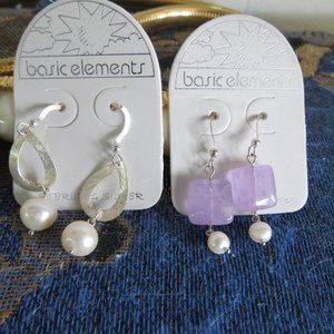 3 pairs of Sterling Silver Dangle, hook style earrings by Basic Elements. One pair is a purple and pink glass bead dangle, one pair is pearl, and one pair is Amethyst and Pearl. All new with tags. I love to bundle, I have more earrings so lets make a deal!