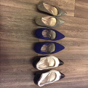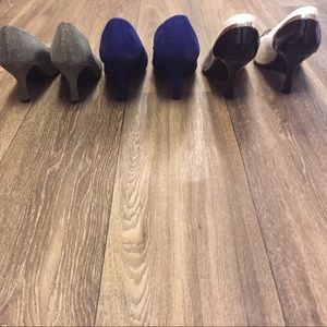 There's a reason I have multiple pairs of these heels- they are the most comfortable pair of heels you will ever own! Each pair is a 3" heel. First pair is black & white patent leather, with a bronze trim. Second pair is a royal blue suede. Third pair is a silver/gold embellished.