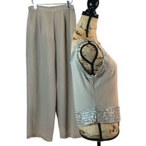 3 pc J Kara Formal Pant Suit Set Beaded Long Sheer Jacket Tank Top Beige 6 P