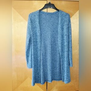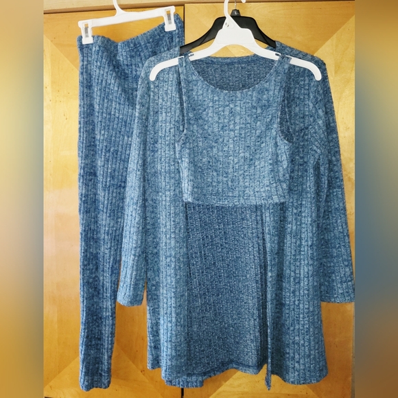 Stylish blue knit two-piece set. Includes a long-sleeve top and matching pants. Perfect for cozy days.