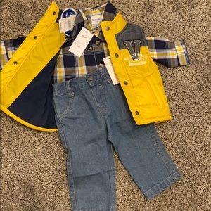 12 month 3 pc. Set yellow vest, plaid button up, jeans