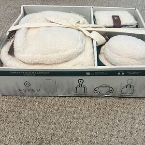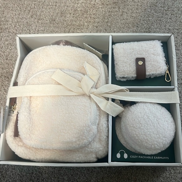 Cute three-piece set with wallet, backpack, and earmuffs all of the sherpa material beautiful set