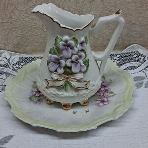 Vintage Porcelain Water Pitcher Vase, trimmed w/14 K Gold Trim Purple Flowers Milk Glass Lefton? This vintage porcelain water pitcher is a beautiful addition to any collection. Featuring delicate purple flowers and real gold trim, it is sure to catch the eye. Not sure if it’s made by Lefton, I found a similar piece but nothing exact. it is crafted from high-quality porcelain and has a milk glass finish. Perfect for serving water or other beverages, this pitcher is both functional and aesthetically pleasing. The white color and elegant design make it a versatile piece that will complement any kitchen or dining room decor. Could be used as a creamer or vase as well, either way it’s absolutely gorgeous. Measures 6” tall. ( Does have some chipped blossom petals which are shown in last pictures, not very noticible.).