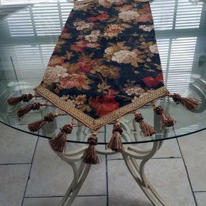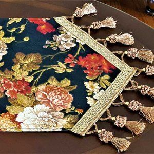 Table Runner- Black w\ Vintage floral design w\ Gold Tassel Fringe
