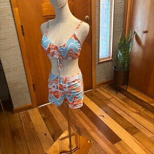 New without tags, this bright bathing suit set is a large. The top with a built in bra for support and adjustable straps would fit anywhere from 38B to 42C. The cover up is nice and long designed to hit at the knee.