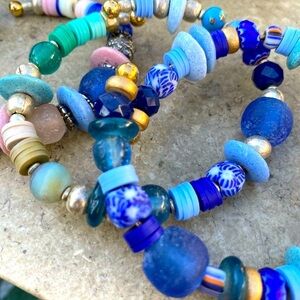 3 piece Handmade bracelet set /stack, in beachy blues. African glass beads.