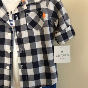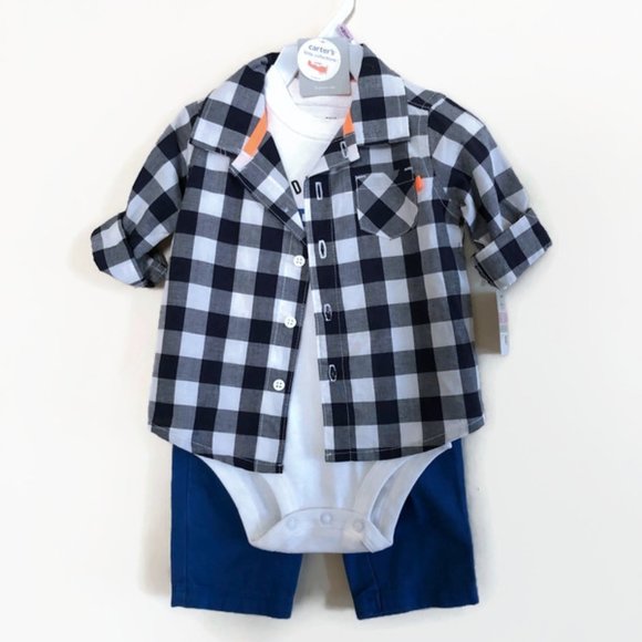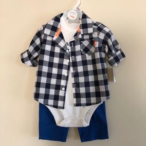 Carter's Baby 3 piece set with white onsie, blue pants and a button down black, white and grey checkered flannel