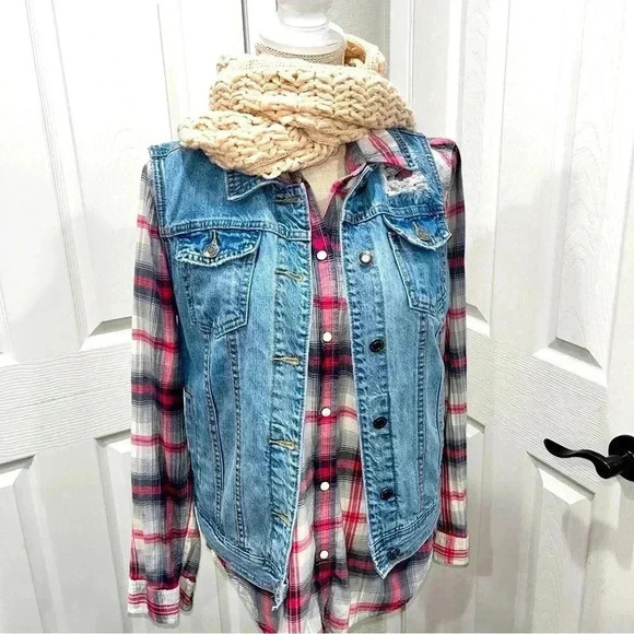 3 piece lot American Eagle boyfriend plaid cats eye snap up, denim vest & scarf