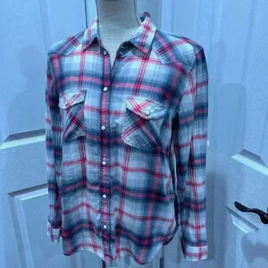 1. American Eagle boyfriend fit, cats eye snap up, long sleeve, plaid double breast pockets, fitted