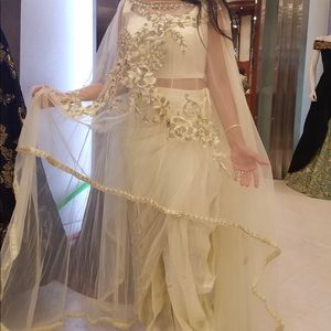 The crop top and the pants are pure satin material and the cape is hand embroidered with some stone work on a net material