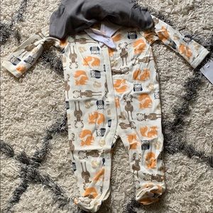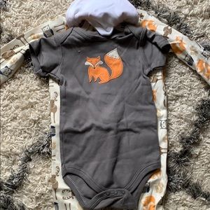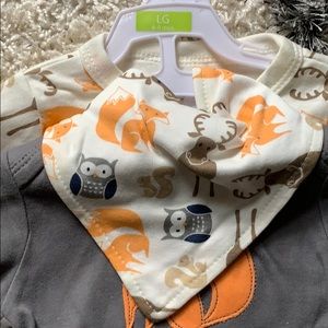 3 piece Hudson baby set includes bib, short sleeve fox onesie and long sleeve woodland character onesie with footies. 6-9M NWT