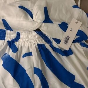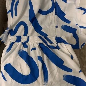 3 piece set in color white and blue includes: bralette, blouse and shorts (regular length) in size small.