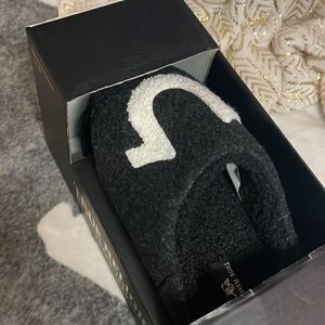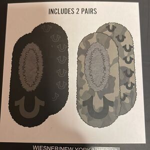 S/n 2024 dark grey/black brushed wool/ fur w/tru religion white U logo in sherpa/.terrycloth nib/nwt marp $68 .true religion mens size large (11/12) ((womens size 11/12+))) slipper socks (2 in package) one camoflauge fur & sherpa/wool fuzzy lining,- black logo symbol, 2nd pair black teddy/fleece/sherpa fur black w:grey accent & interior & logo all NIP msrp$45
