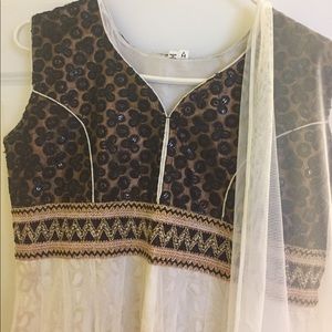 Three piece tunic set includes black and white tunic with sequins, embroidery and velvet border. Plain white leggings and net scarf/shawl. Can be worn as a tunic with leggings or alone as a long dress. New, never worn. Simply elegant!