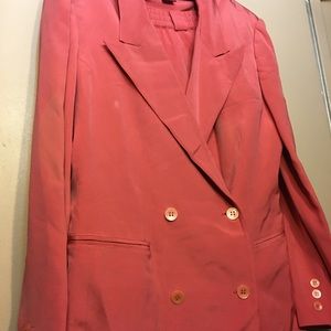 Designer Silk Suede 3 piece suit. Light orange, sexy long skirt and pants. Slight stain on jacket sleeve hardly noticeable. This is A Designer outfit. Double breasted jacket. A fav of mine.