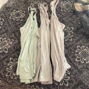 3 pack work out tanks. Racer back style. Very stretchy! Two tops have only been worn once. Two are under armor brand and the other is Danskin brand. Great to add to your workout collection. Two are size large and other is medium but all fit about a size large. Very stretchy! Light blue and mint green pastel color