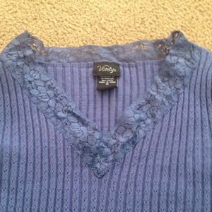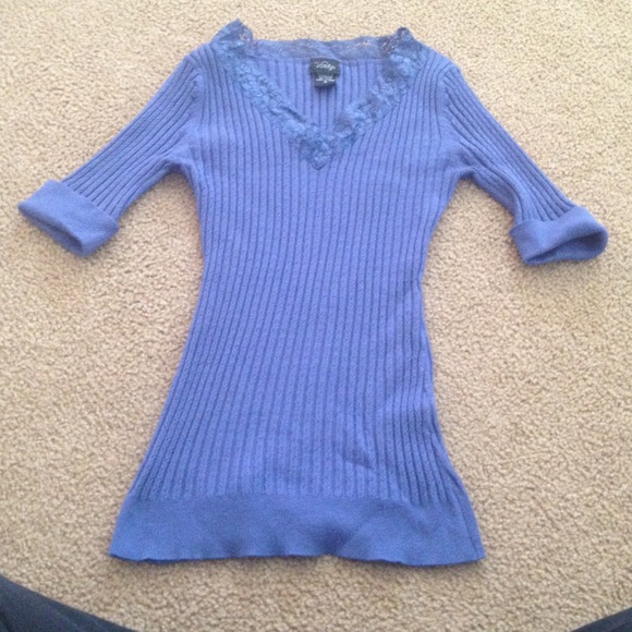 Pretty blue top from vanity 3 quarter sleeve with lace around neck like new only worn a few tomes size M