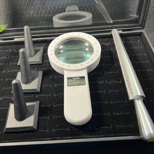 3 ring sizers 1 magnifying glass and 1 ring sizer