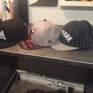 -Black LA baseball gulgot snapback. -Grey Chicago backetball 9fifty SnapBack. -Blue NY baseball American Needie SnapBack.