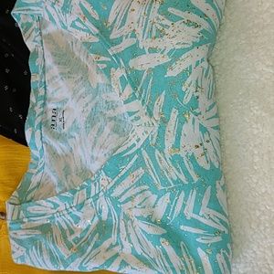 golden color blouse w embroidery and beading at shoulders, black sleeveless blouse w zip back, mint green and white T w gold flecks