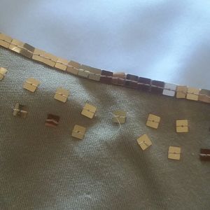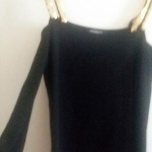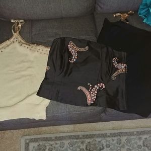 3 party tops- some beads missing (see pics). Gold sleeveless, trimmed in gold metallic; black strapless with multi colored paisley embroidery;& black open shoulder 3/4 length sleeves and gold beaded trim (bundle)
