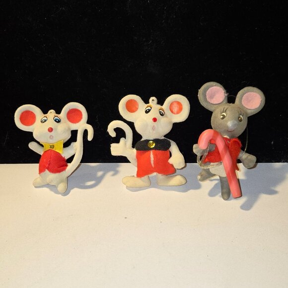 Add a touch of nostalgia to your holiday decor with these 3 charming vintage flocked mouse ornaments. Perfect for collectors, these adorable mice bring whimsy and warmth to any Christmas tree or festive display.