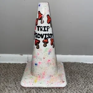 I painted it myself, it’s says trip advisory but it’s kinda hard to see just because of the way the cone is shaped, normal sized traffic cone.