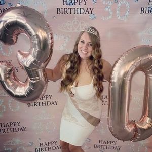 30 backdrop 6' by 6' hand this on your wall or splurge for poles to hang this up! Super cute for photos! I will be listing a sash and crown that match as well, all used 1 day paid $100 for everything (crown, sash, backdrop)