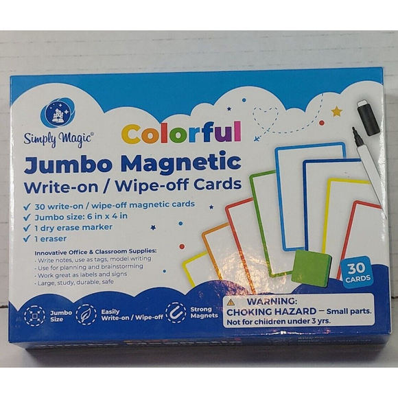 Enhance your productivity with these 30 jumbo magnetic write-on wipe-off cards that come with a dry erase marker and eraser. Measuring 6 x 4 inches, these cards are perfect for labeling and organizing your office supplies, inventory, or even your fridge. The magnetic feature makes it easy to stick them on any metal surface without causing damage.