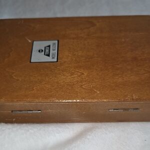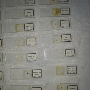 30 Piece Collection of various microscope slides with labeled specimens. Ideal for educational purposes. They are vintage prepared microscope slides, which are thin pieces of glass used to hold specimens for examination under a microscope. Some specimens are Fly Wing, Onion Skin, Pine Root, And much more. The slides are held in a fitted wooden case that says TOWER MODEL NO.6398, which is a common way to store and protect the collection. Some of wear on sticker.