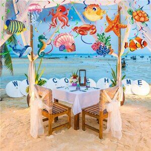🧿Easy to install: these under the sea party supplies can be directly hung where you like with the hook on the top, such as ceiling, door, windows, doorway, overhang, arch, porch, tree branches in your backyard, and so on; They are ideal for suitable indoor and outdoor parties or activities