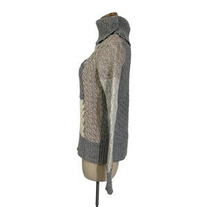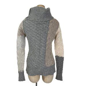 Sundance knit wool blend sweater knit patchwork gray, cream, light brown, cowl neck with buttons