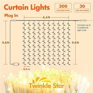 🧿Excellent High Quality: 6.6ft*9.8ft(width*length), 300 WARM WHITE LED lights. UL Certificated Output and wire: 29V Voltage Safe Curtain Lights with UL certified, leads to 29V safe output by UL plug-in transformer.