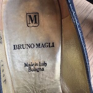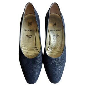 Bruno Magli is an Italian luxury leather brand. These sophisticated black heels feature a timeless design and high-quality construction, synonymous with the Bruno Magli brand. Made in Italy, Bologna. The shoes have a 'Pelle' stamp which translates to leather. They have a comfortable 2.5" heel. The raised embossed design gives them a unique shimmery appearance.