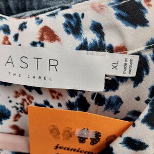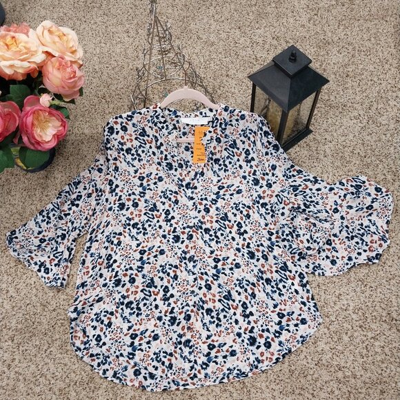 3001 Size XL Aster Button Down Tunic In Blue And Rust Leopard Print. Pit to pit 22" length 27" sleeve 17".