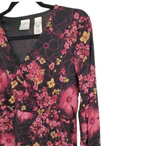 Emma E James by Liz Claiborne Black Floral Wrap Sheer Sleeve Top Size S