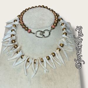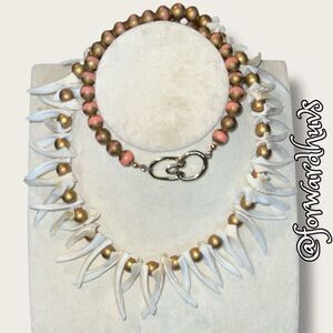 This bold necklace features a series of white, irregularly shaped jagged shells interspersed with brass and pink-colored beads, creating a striking and textured design. The raw, organic elements reflect the Brutalist aesthetic, making this a standout statement piece. Measuring 30 inches in length, the necklace is secured with a silvertone clasp, consisting of a circle on one side and a hook catch on the other, ensuring a secure fit.