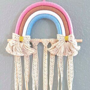 These are brightly colored cotton rope rainbow hangings with seven durable lace bows, meant to organize and hold hair bows, barrettes, scrunchies, etc. This cheery hanging is available in two color styles - red, yellow, green and blue or pink, brown, white, blue. The ends of the rainbows are tasseled and feature decorative lace bows with a gold accent.