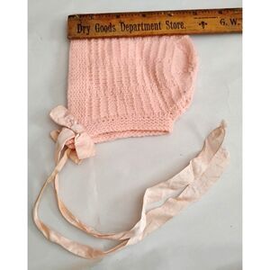 Sweet vintage hand knit baby bonnet in pastel pink with original silk ribbon ties and bow. Perfect for a life size doll. Good condition.