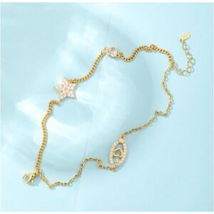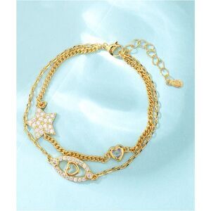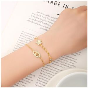 This double-stranded gold bracelet has a rhinestone star, eye, and heart.