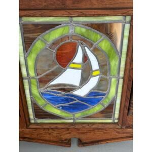 Vintage stained glass window hanging featuring an English old world sailing ship boat decor.